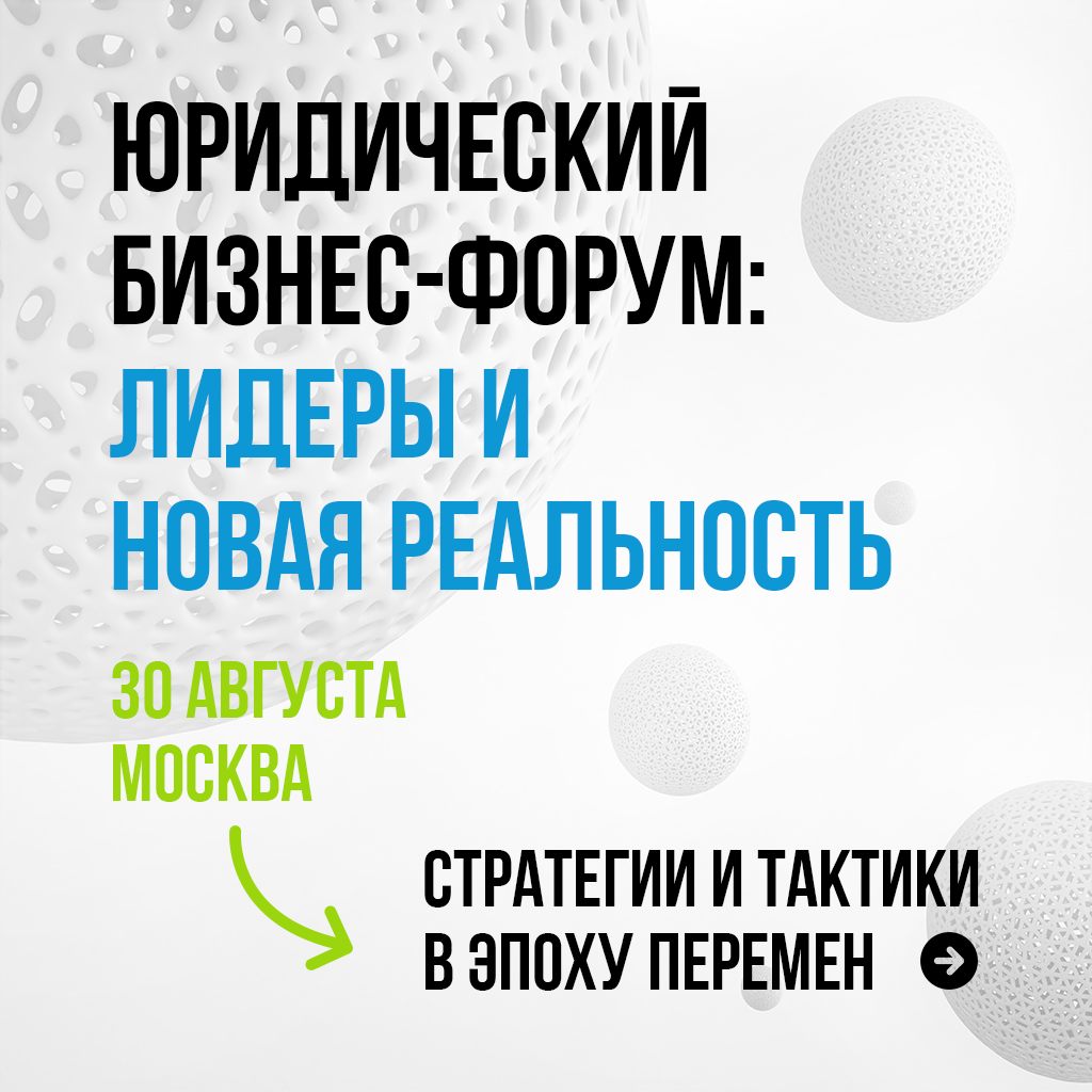 30 августа 2023, МоскваЮридический бизнес-форум: лидеры и новая реальность - это профессиональная площадка для развития диалога и деловых связей между представителями консалтинговых и юридических фирм, адвокатских образований, юридических департаментов корпораций, власти, СМИ, рейтингов, операторов рынка, IT-компаний и т.д.